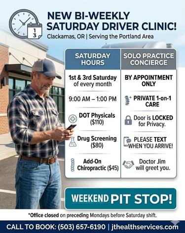 Starting this month, I’m opening up the shop on the 1st and 3rd Saturday mornings of every month. No fanfare, no corporate mandate—just a chance to get your DOT physical, a drug screening, or a quick adjustment done when the world isn't quite so loud.