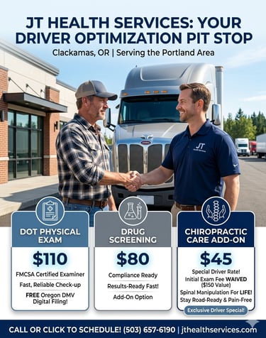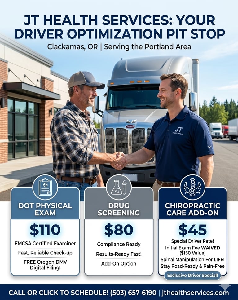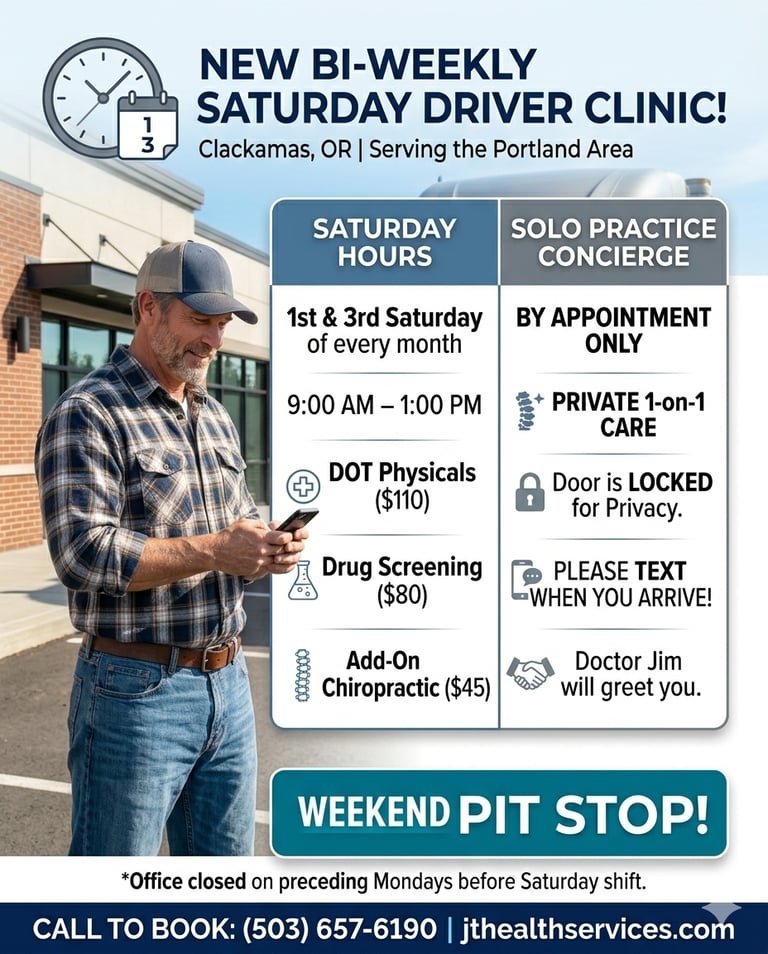xperience the old-school Saturday morning clinic. Open 1st & 3rd Saturdays in Clackamas for DOT physicals and $45 chiropractic adjustments.